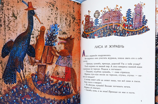 ロシア民話「キツネとツル」「アオサギとツル」など全4話収録の絵本。イラストはロシアの人気グラフィックアーティスト、ヴェーラ・パヴロワが担当。ほぼ全ページに描かれたグラフィカルで色彩豊かな美しいカラーイラストが楽しめる。